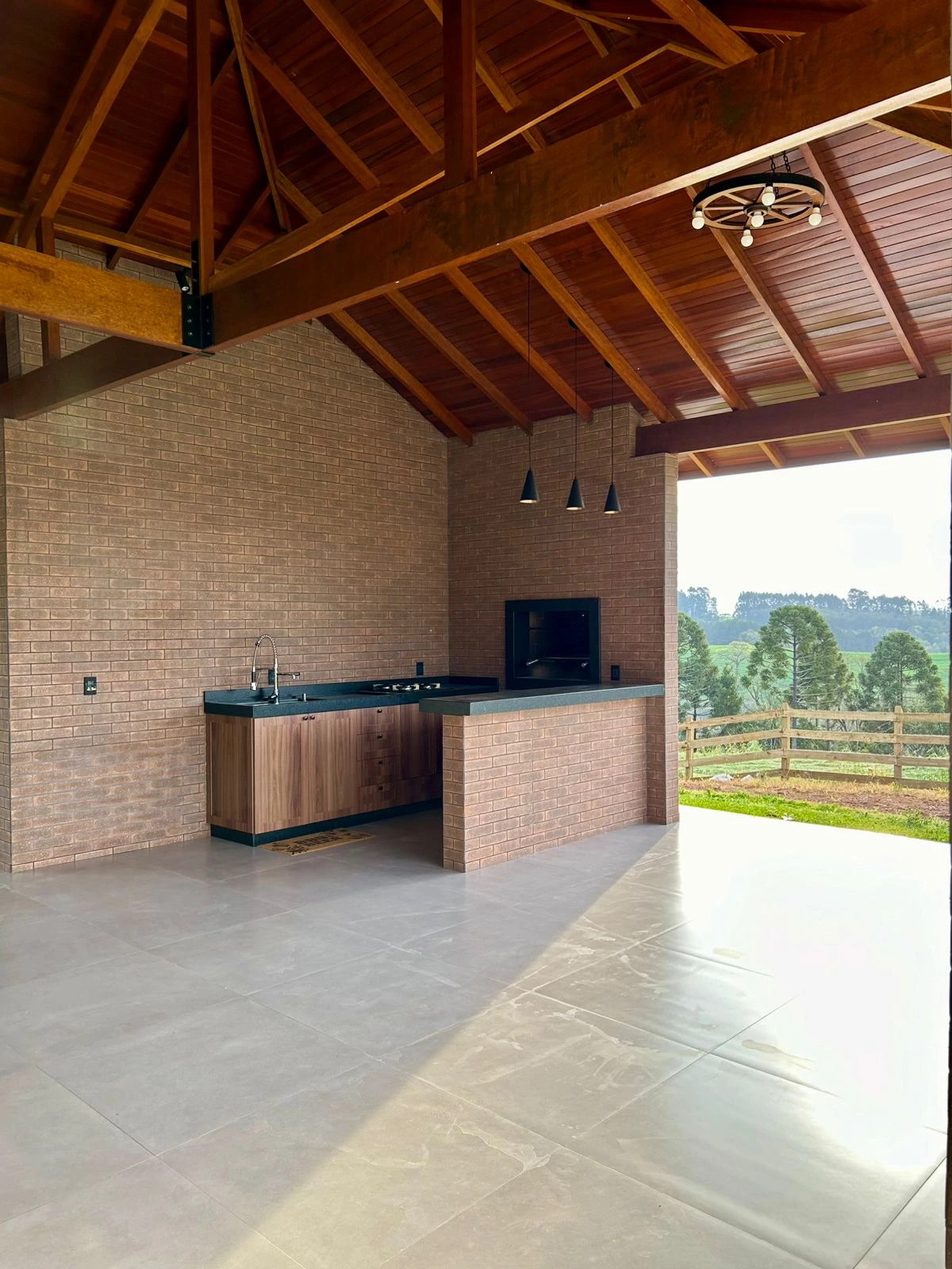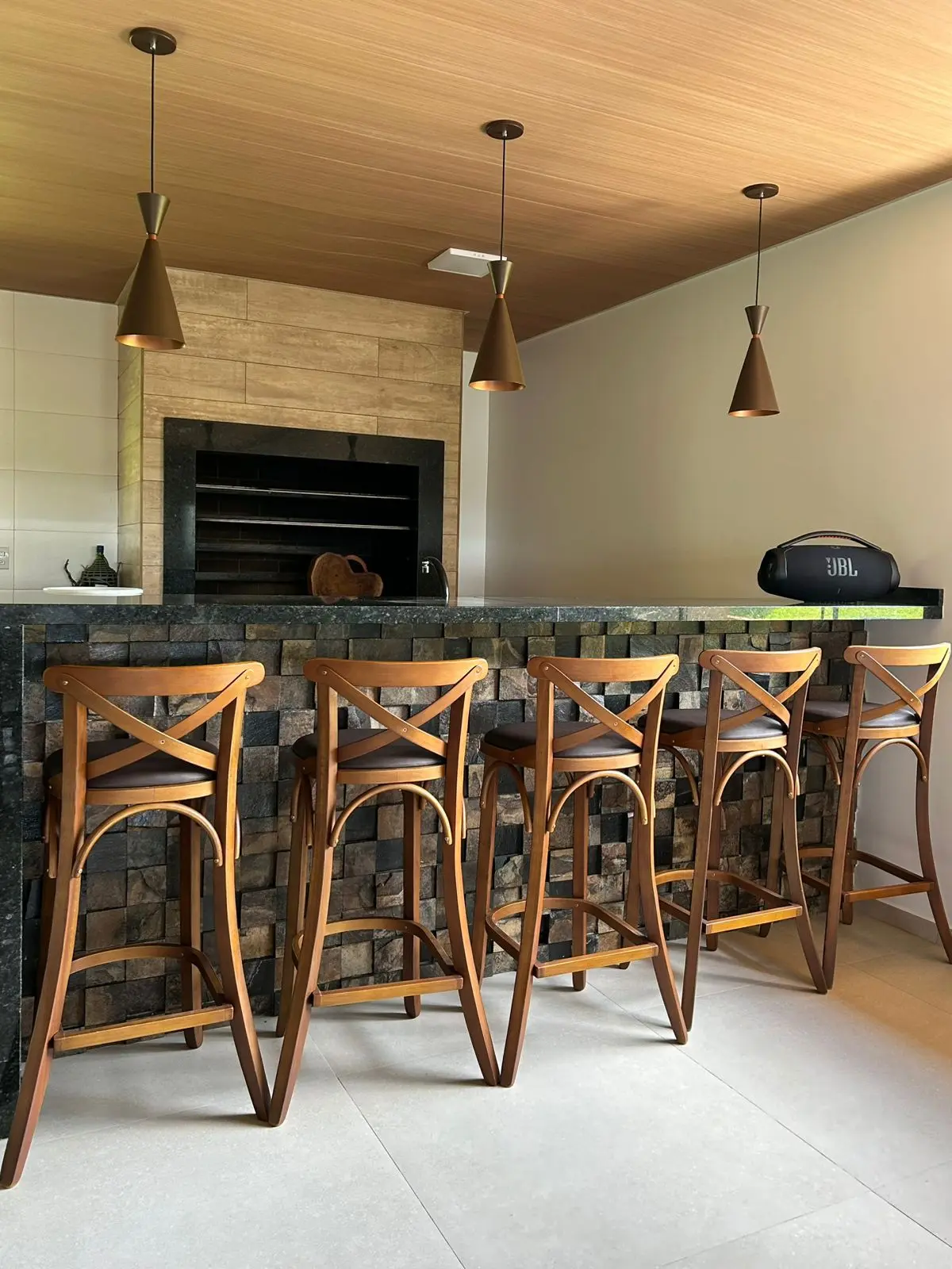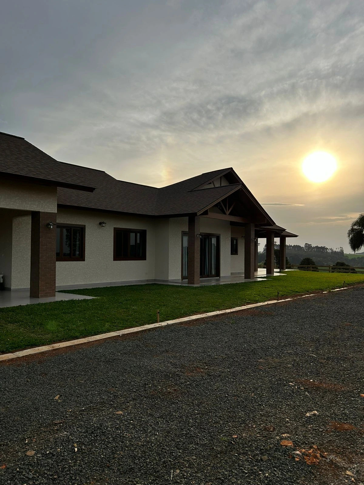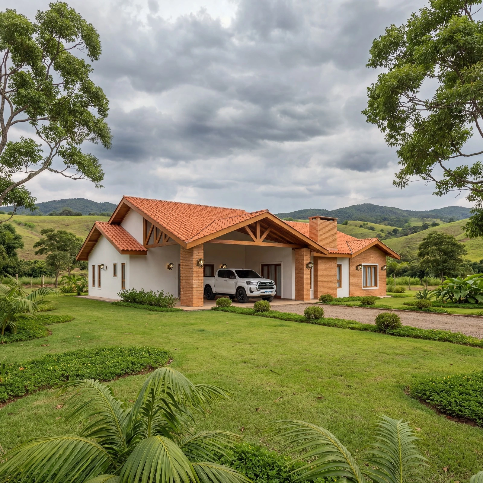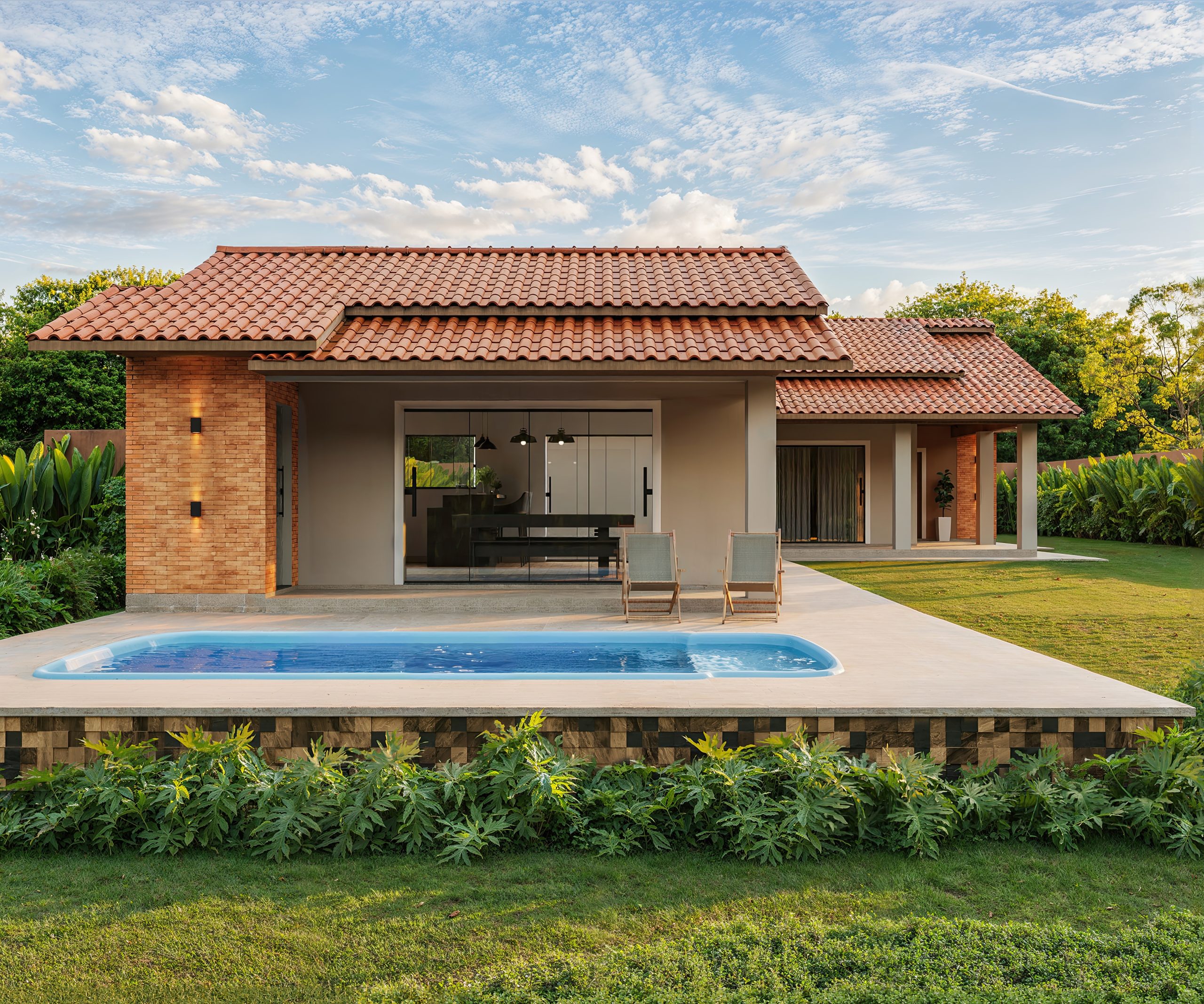 Planejamento de áreas como lareira externa, piscina, acesso principal e organização do entorno da casa, sempre de forma simples e prática.